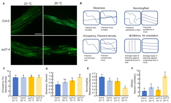 Effect of prolonged moderate-high temperature stress on cellular actin organization in Col-0 and act7-4. (A) Confocal images of ABD2-GFP and act7-4 ABD2-GFP at 23 and 29 °C (Bars = 50 µm). (B) Schematic representation of quantified actin parameters. Quantification of actin filaments (C–F). (C) Percent occupancy, (D) Skewness, (E) NormAvgRad, and (F) ∆θ in degree. Five-day-old seedlings were transferred to new agar plates and subjected to high-temperature (29 °C) and control temperature (23 °C) treatment for 3 days under light condition. Vertical bars represent mean ± SE of the experimental means from at least three independent experiments (n = 3 or more), where experimental means were obtained from 30 to 50 cells. Comparisons between multiple groups were performed by analysis of variance (ANOVA) followed by the Tukey–Kramer test. The same letter indicates no significant differences (p < 0.05).