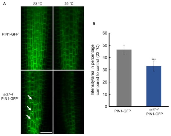 Directional flow of auxin facilitated by PINs and AUX/LAX transporters maintains root development [,,]. Both PIN1 and PIN2 mediated auxin flow contributes in maintaining proper root length and meristem size []. Actin filament polymerization and depolymerization block PIN1 trafficking in Arabidopsis root []. Latranculin B (LatB)-induced depolymerization of actin filaments produces intercellular agglomeration of PIN2 []. Since prolonged moderate-high temperature affects the root elongation and also alters the cellular actin dynamicity, we therefore examined whether high temperature affects the localization or the expression of PIN1 and PIN2 in wild-type and act7-4 mutant. Both the PIN1 and PIN2 abundance, but not the localization was affected by prolonged high temperature treatment (Figure 3 and Figure 4). Moderate-high temperature affects the abundance of both PIN1 and PIN2 in wild type and act7-4, albeit differentially. Quantitative data obtained from GFP fluorescence analysis show that the reduction of PIN1 abundance at 29 °C is 46.5% and 33% in wild-type and act7-4 background, respectively, compared to 23 °C (Figure 3). PIN2 abundance was found to be more affected in the act7-4 background. In wild type, the decrease in PIN2 abundance was 35%, while in in act7-4 it was 75% (Figure 4B). To confirm that the high temperature-induced alteration in PIN abundance is ACT7 specific, we also checked act8-2 PIN2-GFP. As expected, no change was observed in PIN2 abundance in act8-2 mutant background comparing to wild-type under long-term moderate-high temperature treatment (Supplementary Figure S1).