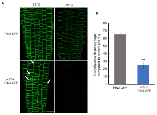 Prolonged moderate-high temperature diminishes PIN2 abundance drastically in act7-4 roots. (A) Cellular imaging of PIN2-GFP and act7-4 PIN2-GFP at 23 °C and 29 °C. Bar = 25 µm. Arrowheads indicate the intracellular agglomeration of PIN2 (B) Quantification of GFP fluorescence intensity from (A). The images were captured using the same confocal setting. Asterisks represent the statistical significance between the means of the percentage Col-0 and mutant judged by the Student’s t-test (*** p < 0.001). Vertical bars in the graph represent mean ± SE of the 15–20 seedlings from at least three independent experiments. Five-day-old light grown seedlings were transferred to new agar plates and subjected to high-temperature treatment (29 °C) for 72 h before imaged with confocal microscopy using the same confocal settings. Images are representative of 15–20 seedlings obtained from three independent experiments.