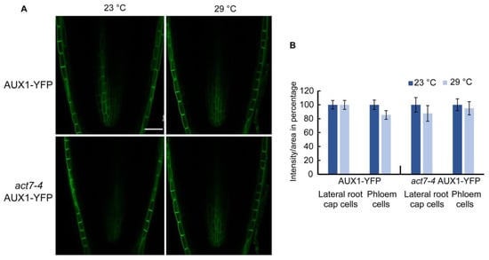 Prolonged high temperature does not alter AUX1 abundance in Col-0 and act7-4 mutants. (A) Cellular imaging of AUX1-YFP and act7-4 AUX1-YFP at 23 and 29 °C. Bar = 25 µm. (B) Quantification of GFP fluorescence intensity from (A). Five-day-old light grown seedlings of AUX1-YFP and act7-4 AUX1-YFP were transferred to new agar plates and subjected to high-temperature treatment (29 °C) for 72 h before imaged with confocal microscopy using the same confocal settings and are representative of 15–20 seedlings obtained from three independent experiments. Bar = 25 µm.
