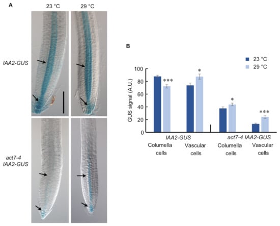 GUS staining was performed as described earlier []. In brief, 5-day-old seedlings were transferred to a new agar plate and grown vertically at 23 and 29 °C under continuous white light. After 72 h, IAA2-GUS and act7-4/act8-2 IAA2-GUS seedlings were transferred to GUS staining buffer (100 mM sodium phosphate, pH 7.0, 10 mM EDTA, 0.5 mM potassium ferricyanide, 0.5 mM potassium ferrocyanide, and 0.1% Triton X-100) containing 1 mM X-gluc and incubated at 37 °C in the dark for 1 h. For cell clearing, Visikol was used as per manufacturer’s instruction. The roots were imaged with a light microscope (Nikon Diaphot) equipped with a digital camera control unit [Digital Sight (DS-L2); Nikon, Tokyo, Japan (http://www.nikon.com/, accessed on 30 May 2021).