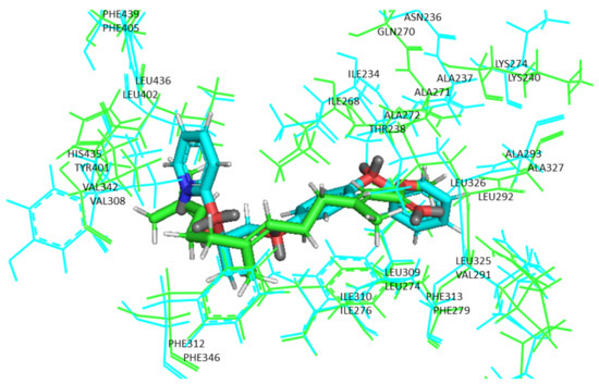 The structure of EcR was obtained using the two monomers modeled with a homology model approach [35]. Before monomers construction, the similarity between the sequences was verified using the sequences of the LBD present in UniProt (https://www.uniprot.org/. Archived on 10 October 2019): Q9NG48 for USP, and A2PZF8 for EcR. The analysis of the sequences showed that USP has an identity of 69.51% with the RXRα of H. sapiens [36]. Using the Clustal (https://www.ebi.ac.uk/Tools/msa/clustalo/. Archived on 22 October 2019) program, comparison of the two sequences was done to verify the preservation of residues important for the ligand binding and for the stabilization of the H12 in an agonist conformation. These residues were identified through literature research (Ala271, Ala272, Gln275, Trp305, Asn306, Phe313, Arg316, and Cys432) [29]. As shown in the alignment (Figure 1) most of the residues are preserved. There are exceptions for some residues that are replaced by residues with the same chemical properties, Gln270 is replaced by Asn236, Leu315 is replaced by Val291. The only exception is His435 that is replaced in USP by Tyr401. This could affect the ligand binding. Moreover, the structures of USP and RXRα were compared in the binding pocket region to analyze the preservation of the residues and of the structure.