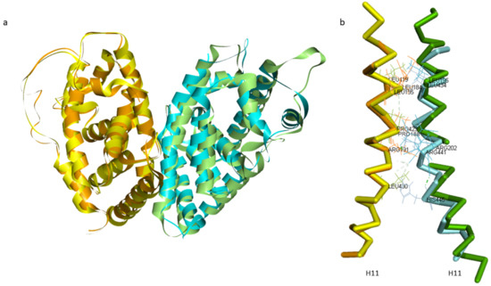 Two monomers of A. mellifera, USP and EcR, and H. sapiens, RXRα (PDB ID: 1FM6) and FXR (PDB ID: 4QE6), were superimposed on the RXRα-FXR dimer structure of H. sapiens (PDB ID: 6A5Y) in order to place them at the right distance for the formation of the dimer. Through literature research, information was obtained on the interface surface of the two bee monomers and on the presence of amino acids important in the interaction of monomers for the formation of the dimer in some insects B. ovis, T. castaneum, and H. virescens [37]. The structural similarities of the EcR-USP of A. mellifera and RXRα-FXR of H. sapiens were analyzed, and specifically the interactions between the two monomers, to assess whether there is preservation in the interaction for the formation of the dimer. The intermolecular interactions are grouped into polar and nonpolar interactions. The nonpolar interactions include Van der Waals’s contacts and hydrophobic interactions with a distance cutoff of 4.5 Å, while the polar interactions include charged interactions (5.5 Å cutoff) and hydrogen bonds (4.0 Å cutoff). Close examination of the two dimers interfaces reveals that the residues present in the interface surfaces and residues that promote the interaction between monomers are preserved except for one residue: Asn206 in the EcR structure is replaced by His445 in the FXR structure. The interactions between both USP and EcR and RXRα and FXR were stabilized by a combination of hydrophobic and electrostatic interactions of the monomers: (i) in A. mellifera the nitrogen atom of Arg191 in USP makes an electrostatic interaction with the oxygen atom in EcR, while Pro188, Leu184, and Leu185 in USP form hydrophobic interactions respectively with Arg202 and Leu195 in EcR; (ii) in H. sapiens Leu419, Pro423, and Leu430 in RXRα make hydrophobic interactions respectively with Leu434, Arg441, and His445 in FXR (Figure 3) [33,38]. RXRα and FXR interact via the conserved asymmetric dimer interface composed mainly of H11 in each monomer [39]. Comparing the structures, the interface among all dimers is very similar, both in terms of the distance between monomers and in the secondary structures involved in the interaction between them.