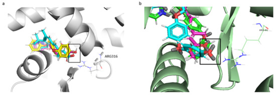 Ligand-receptor interactions. (a) The human hydrogen bond formed between the oxygen of 9-cis-RA (cyan) and 4′-OH-PPF (magenta) and Arg316. The box highlights the oxygen present in 9-cis-RA and the 4′-OH-PPF, but not in the pyriproxyfen (yellow). (b) The bee hydrogen bond formed between the oxygens of the juvenile hormone (cyan) and 4′-OH-PPF (magenta) and Arg81. The box highlights the oxygen present in the juvenile hormone and 4′-OH-PPF. The pyriproxyfen (green) does not have the oxygen for the hydrogen bond.