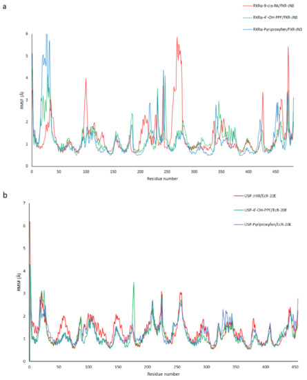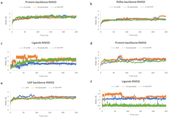 In the case of A. mellifera, the RMSD value of the protein backbone (USP-EcR) for the two systems (the dimer in complex with juvenile hormone and the dimer in complex with pyriproxyfen) increased ranging from 1.0–5 Å and ultimately attained equilibrium at about 80 ns, while for the dimer in complex with 4′-OH-PPF—increased ranging from 1.0–3.5 Å and ultimately attained equilibrium at about 40 ns (Figure 5d). Upon binding, the averaged RMSD for the complex of USP-EcR with JHIII, pyriproxyfen, and 4′-OH-PPF was 3.29, 3.56, and 2.87 Å, respectively. As we can see from the graph, the dimer in complex with 4′-OH-PPF has the same constant and stable trend for the molecular dynamic simulation. To get insights into the stability of the systems, the RMSD value of the RXRα monomer backbone was calculated. The Figure 5e shows that USP is more stable with the 4′-OH-PPF (RMSD average 2.55 Å) and with pyriproxyfen (RMSD average 2.66 Å) than natural ligand (RMSD average 2.91 Å). Thus, the RMSD of each ligand, juvenile hormone, pyriproxyfen, and 4′-OH-PPF, with respect to the initial positions of the ligand atoms was evaluated for each complex (Figure 5f). During the simulation, there is no significant fluctuation in the 4′-OH-PPF molecules when they are present in USP. The stability of this molecule in the binding cavity is due to the hydrogen bonds that contribute to the small fluctuations of the protein–ligand complex. A similar trend is seen in the pyriproxyfen graph where at about 80 ns there is an RMSD decrease and it ultimately attains equilibrium.
