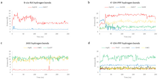 Comparing the formation and persistence of hydrogen bonds network between the ligands and the protein, it is worth to note that the interaction between 9-cis-retinoic acid and RXRα, and 4′-OH-pyriproxyfen and RXRα is characterized by the formation and breaking of two hydrogen bonds: one occurs only for few nanoseconds at the beginning of the simulation and the second one is maintained during the total simulation. In fact, the residues involved in the ligand-binding during the simulation are equal for the two complexes. Contrarywise, pyriproxyfen establishes with residues of RXRα only weak and small hydrophobic interactions resulting in a major instability of the system. The interaction between the oxygen both 9-cis-RA and 4′-OH-PPF and Arg316 breaks at the beginning of the simulation, while the hydrogen bond between 9-cis-RA and 4′-OH-PPF and Ala327 and Asn306 is mostly stable for the total simulation run, contributing to the 42.50% and 49.58% followed by the interaction with Ile268 (1.25%) and Ala327 (2.08%) respectively. These interactions are explained by the graphs showing the distances between the residues of the protein and 9-cis-retinoic acid and 4′-OH-pyriproxyfen (Figure 6a,b). The same situation of RXRα is detected for USP. As we can see in Figure 6c,d the interaction between the oxygen of both the juvenile hormone and 4′-OH-PPF and Arg81 breaks at the beginning of the simulation. After that, JHIII and 4′-OH-PPF form other hydrogen bonds with some residues in the binding cavity: Ala92 (53.00%) and Cys197 (0.04%) in the case of juvenile hormone and Ala92 (48.28%), Thr37 (0.12%), Ala36 (0.04%), and Gln40 (0.22%) in the case of 4′-OH-pyriproxyfen.