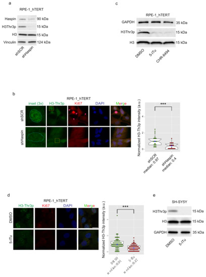 Haspin is active in G0 phase. (a) RPE-1_hTERT cells stably silenced with shSCR (control) or shHaspin were seeded and harvested after 48 h serum starvation to induce entry in G0. Silencing efficiency and H3-T3 phosphorylation were monitored by Western blotting; (b) immunofluorescence against Ki67 (proliferation marker) and H3-T3 in shSCR and shHaspin cells serum-starved for 48 h. Histone phosphorylation was quantified and is reported to the right. Silencing control is shown in Supplementary Figure S1e; (c) RPE-1_hTERT cells were seeded and serum-starved for 48 h, then treated for a further 24 h with DMSO or Haspin inhibitor 5-ITu (10 nM) and CHR-6494 (50 nM); H3T3p was monitored by Western blotting; (d) cells treated with 5-ITu were processed for immunofluorescence against Ki67 and H3-T3. Histone phosphorylation was quantified and is reported to the right; (e) Western blot analysis monitoring the levels of H3-T3p in SH-SY5Y that were differentiated into neuron-like cells, as described in Material and Methods, and then incubated for 24 h with 10 nM 5-ITu. Graphs in b, d show the median abundance of phosphorylated H3-Thr3; boxes include 50% of the data points, notch represent confidence interval (median ±1.58 IQR/sqrt(n)). t-test was applied as a statistical measurement, n.s.; not significant, *** p < 0.005. Scale bars in b, d: 20 µm.