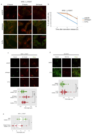 Loss of Haspin leads to longer and more persistent primary cilia. (a,b) shSCR and shHaspin were treated as described in Figure 1. For Haspin inhibition, entry into G0 was achieved by 48 h of serum starvation to induce ciliation. 5-ITu was added after the first 24 h of starvation. Cells were then incubated in the presence of serum to induce cell-cycle entry and cilia resorption. Samples were analyzed by immunofluorescence in G0, 2 h, and 24 h after serum readdition. Cells were fixed and processed for immunofluorescence against γ-tubulin and acetylated tubulin; representative images are shown in (a), and the percentage of cells with or without cilia is shown in (b); error bars represent standard deviation; (c) cells were processed as above to measure cilia length at the end of the incubation in serum-free medium. Representative images are shown; (d) SH-SY5Y cells were differentiated and processed by immunofluorescence to visualize basal bodies (γ-tubulin) and cilia (ARL13B). Representative images are shown; (e) RPE_1-hTERT cells were transfected with GFP or Haspin–Venus encoding plasmids and serum-starved for 48 h. At the end of the starvation, cells were fixed and processed for immunofluorescence to measure cilia length. Graphs in (c–e) show the median cilia length calculated as described in Material and Methods; boxes include 50% of the data points, notch represent confidence interval (median ± 1.58 IQR/sqrt(n)). t-test was applied as a statistical measurement, n.s.; not significant, * p < 0.05, *** p < 0.005. Scale bar in (a): 20 µm, (c,d): 5 µm.