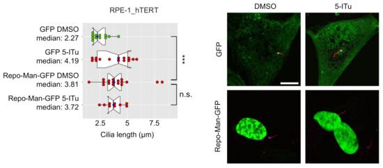 Although being the most characterized, H3-Thr3 is not the only known target of Haspin [44,45]. To gain a first mechanistic insight on how Haspin activity regulates primary cilia dynamics, we investigated whether H3-Thr3 dephosphorylation was sufficient to reproduce the defects observed upon loss of Haspin activity. H3-Thr3 has been shown to be dephosphorylated by PP1 in a Repo-Man-dependent manner, and overexpression of Repo-Man promotes efficient H3-Thr3 dephosphorylation [2]. We overexpressed Repo-Man-GFP in RPE-1_hTERT cells and serum-starved them to induce ciliogenesis. As shown in Figure 3, Repo-Man led to the formation of a significantly longer cilium, similar to what was observed by Haspin inhibition. Remarkably, when Repo-Man was overexpressed, 5-ITu did not further affect cilia length. These observations show that Haspin inhibition is not additive to Repo-Man overexpression, emphasizing the role played by histone H3-Thr3 and excluding possible off-target effects.