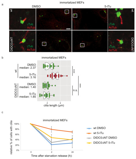 A Dido3∆NT mutant was shown to be incapable to bind H3K4me3, while still effectively localizing to the basal body along with HDAC6, with a concomitant shortening of cilia in serum-starved MEFs [22]. In the same MEFs, we monitored whether the long cilium phenotype induced by Haspin inhibition could be reverted by Dido3∆NT. As shown in Figure 4a,b, Haspin inhibition in MEFs caused a significant increase in the length of the cilia. On the contrary, MEFs expressing genomic Dido3∆NT exhibited shorter cilia that were largely unaffected by 5-ITu treatment. Similarly, the delay in cilia resorption observed in wild-type MEFs after Haspin inhibition was abolished in a Dido3∆NT background (Figure 4c). Similar results were obtained in primary MEFs (Supplementary Information, Figure S3). These observations confirm that Haspin activity promotes the transfer of Dido3 from the chromatin to the basal body where it regulates cilium length and deciliation.