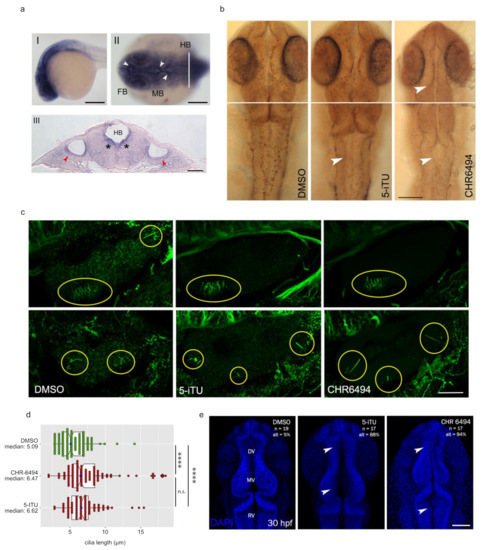 Haspin regulates cilia in the zebrafish embryo. (a-I) expression pattern of zebrafish Haspin at 24 hpf. Lateral view, anterior to the left. The gene is expressed in all brain vesicles; (a-II) dorsal view of the cephalic region, anterior to the left. The neuromeres are all heavily labeled, with a further intense signal pinpointing the whole periventricular portion of the developing brain (white arrowheads); (a-III) histological section conducted according to the plane shown in a-II (white line). The signal is clearly visible in the cells surrounding the ventricles (black asterisks) and the cells of the otic vesicle (red arrowheads). FB, forebrain; MB, midbrain; HB, hindbrain; (b) embryos were treated with either DMSO, 5-ITU, or CHR-6494 until 48 hpf, when they were processed for immunohistochemistry with a phosphorylated H3-T3 antibody. Dorsal views are shown; white arrowheads indicate points of reduced histone phosphorylation; (c,d) embryos were incubated with DMSO or Haspin inhibitors for 72 h when they were fixed and processed for immunofluorescence against acetylated tubulin. Yellow circles indicate ciliated regions, two different z stacks for each sample are shown; cilia length was measured and is reported in d; boxes include 50% of the data points, notch represent confidence interval (median ± 1.58 IQR/sqrt(n)). t-test was applied as a statistical measurement, n.s.; not significant, * p < 0.05, **** p < 0.001; (e) embryos were treated with DMSO or Haspin inhibitors for 30 h and then stained with DAPI to monitor neural tube morphology. Scale bars: (a-I) 200 µm; (a-II) 50 µm; (a-III) 10 µm; (b) 100 µm; (c) 25 µm; (e) 100 µm.