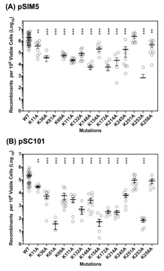 Colonies for both assays (pSIM5 and pSC101) were counted manually, and the level of recombination reported as the number of colonies per 108 viable cells. The mean (±SD) values reported in Table S1 for each Lys to Ala variant are based on a minimum of 6 independent measurements on at least two separate days (in groups of three). Outlier values were excluded, as determined by a Grubb’s test (Extreme Studentized Deviate method) in GraphPad Prism (San Diego, CA, USA) with a significance level (alpha) of 0.05. There were 7 such outliers for the pSIM5 assay (out of 165 independent measurements total), and 9 outliers for the pSC101 assay (out of 138 independent measurements total). Data from each assay were plotted with error bars representing the standard error of the mean (SEM), and assessed for statistical significance (relative to WT) by an unpaired two-sided Student’s T-test with Welch’s correction for unequal variances and sample sizes (* p < 0.01, ** p < 0.001, *** p < 0.0001).