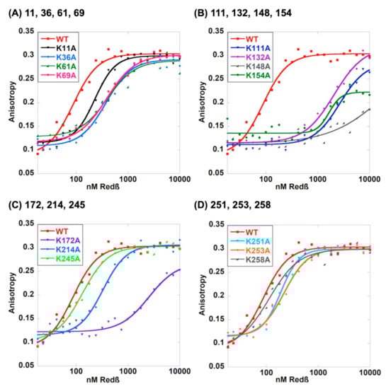 Binding of the 14 Lys to Ala Redβ variants to 5’-FAM 48-mer ssDNA. Groups of three or four variants are plotted together with the same data for WT in panels (A)–(D). Each data point shows the average anisotropy value from three replicates at each titration point. The solid lines represent the fit of the averaged data points at all concentrations for each titration to the Hill equation, as described in Materials and Methods. The apparent Kd values reported in Table 1 are the mean ± SD values from three independent titrations, one of which, that giving the middle value, is shown here.