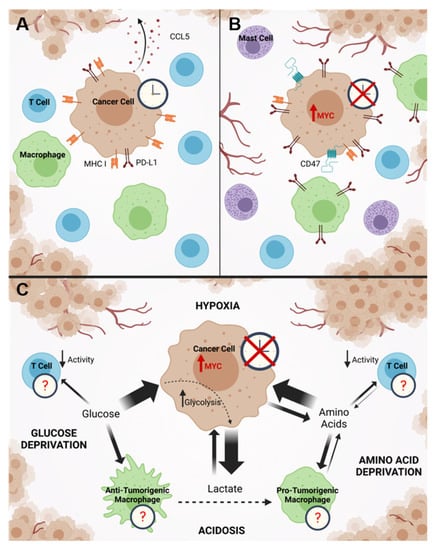 - Casey, S.C.; Tong, L.; Li, Y.; Do, R.; Walz, S.; Fitzgerald, K.N.; Gouw, A.; Baylot, V.; Gütgemann, I.; Eilers, M.; et al. MYC regulates the antitumor immune response through CD47 and PD-L1. Science 2016, 352, 227–231. [Google Scholar] [CrossRef]