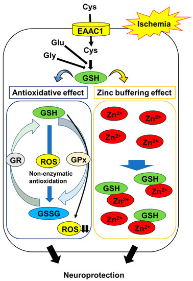Neuronal GSH plays an important role in protecting neurons from cell damage after transient global brain ischemia by ameliorating hippocampal oxidative stress and the disruption of Zn2+ homeostasis. However, transient global ischemia results in decreased levels of neuronal GSH in the hippocampus. While this decrease is caused by oxidative stress and accumulated Zn2+, it is thought that the ischemia-induced decrease in neuronal GSH causes further increases in ROS production and the disruption of Zn2+ homeostasis, eventually leading to neuronal cell death and the impairment of hippocampal functions. In addition, EAAC1 is responsible for the neuronal supply of cysteine, which is the rate-limiting substrate for GSH synthesis. The expression levels of EAAC1, regulated by diurnal fluctuations in the hippocampus, affect susceptibility to ischemic neuronal injury. Therefore, the maintenance of intracellular GSH levels via EAAC1 is essential for neuronal survival after brain ischemia and may be an important therapeutic target.