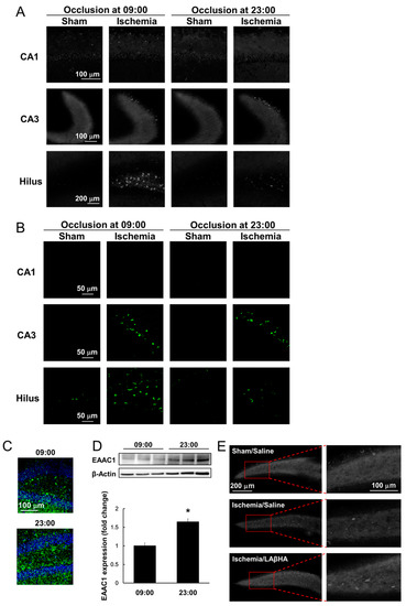 Reduced ischemia-induced Zn2+ accumulation and neuronal injury in response to increased GSH levels via elevated EAAC1 protein expression at 23:00. (A) Representative images showing TSQ fluorescence (indicative of Zn2+ accumulation) in the hippocampus 72 h after transient brain ischemia. Zn2+ accumulation was observed in the CA3 and hilar but not the CA1 region in ischemic mice. Notably, the hilar Zn2+ accumulation was remarkably reduced in mice subjected to transient brain ischemia at 23:00 compared to that at 09:00. (B) Fluorescent images showing neurodegeneration by Fluoro-Jade B staining in the hippocampus 72 h after transient brain ischemia in the CA3 and hilar but not in the CA1 region in ischemic mice. In the hilus, Fluoro-Jade B fluorescent signals were remarkably reduced in mice subjected to transient brain ischemia at 23:00 compared to those at 09:00. (C) Representative images depicting double immunofluorescence staining for glutathione adduct with N-ethylmaleimide (GS-NEM, represents GSH levels; green) and DAPI (blue) in the hilar region. GSH levels were significantly higher in the hilus at 23:00 than at 09:00. (D) EAAC1 protein expression was analyzed by Western blotting. EAAC1 protein levels in the hippocampus were significantly increased at 23:00 compared to at 09:00. * p < 0.05, relative to the hippocampus harvested at 09:00 (Mann-Whitney U test). (E) Representative images highlighting TSQ fluorescence in the hilar region 72 h after ischemia in mice pretreated with L-aspartic acid β-hydroxamate (LAβHA), a selective EAAC1 inhibitor, at 23:00. Ischemia-induced Zn2+ accumulation was significantly increased in LAβHA-pretreated mice.