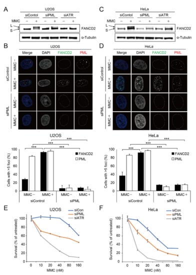 PML NBs are implicated in diverse DNA damage responses and DNA repair pathways. In this study, we aimed to understand the roles of PML NBs in the Fanconi anemia pathway, which is critical for repairing ICL damage. To this end, we depleted PML proteins and tested if FANCD2 was mono-ubiquitinated upon MMC treatment. As a control, ATR protein was depleted because it is required for damage-induced FANCD2 mono-ubiquitination [].