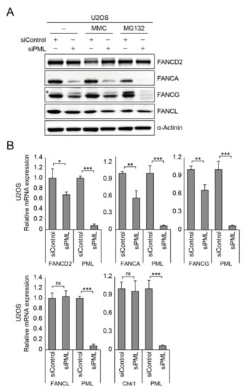 PML NBs control gene expression of Fanconi anemia core complex. (A) After depletion of PML, U2OS cells were treated with 1 μM MMC or 10 μM MG132 for 24 h. Expression of FANCD2 and FA core proteins including FANCA, FANCG, and FANCL was analyzed by immunoblotting assay. The asterisk indicates a cross-reactive artifact. (B) Relative mRNA expression of FANCD2, FANCA, FANCG, FANCL, Chk1, and PML was determined by real-time quantitative PCR in the U2OS cells depleted with PML. Data represent the mean ± SD from three independent experiments (*** p < 0.001; ** p < 0.01; * p < 0.05; ns, not significant (p > 0.05)).