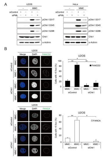 In conclusion, we demonstrated that PML regulates damage-induced CHK1 phosphorylation, which promotes FANCA, FANCG, and FANCD2 gene expression. Cancer cells with p53 mutations rely heavily on CHK1 functions for cancer cell survival, which makes CHK1 a target for cancer therapy. Indeed, the enhanced chemotherapeutic effects of CHK1 inhibitors have been reported. Therefore, CHK1 inhibitors are often used with platinum-based drugs or gemcitabine. Specifically, cancer stem cells exhibit more efficient DNA repair systems [], which often leads to resistance to chemotherapy. Here, we showed for the first time that CHK1 is implicated in the expression of FA proteins, which is important for repairing interstrand DNA crosslinks. These findings suggest that treatment with CHK1 inhibitors might be able to reduce the DNA repair capacities of cancer cells, which increases the cancer therapeutic efficacy.