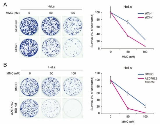 Depletion of CHK1 results in enhanced sensitivity to MMC, which induces ICLs. (A) Sensitivity of MMC was determined by clonogenic assay in HeLa cells treated with siControl or siCHK1. Fixed number of cells were seeded and after 24 h of MMC treatment at the final concentration of 0 to 100 nM. After one week, the colonies were stained by ultraviolet solution. (B) Chemotherapeutic efficacy of HeLa cells treated with 100 nM AZD7762 after 24 h of treatment with indicated concentration of MMC. After one week, the colonies were stained by ultraviolet solution.
