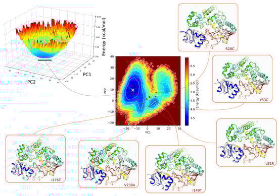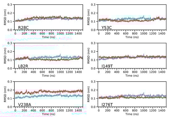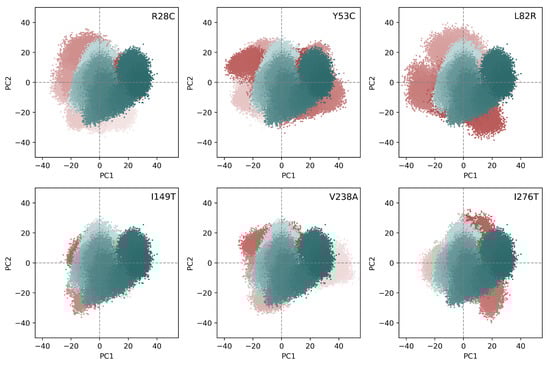 To estimate the overlap between the macromolecular modes, we calculated the RMSIP between the first 20 eigenvectors of the wild type form and each of the six variants. The RMSIP values can be rounded to 0.70–0.8 for all the variants which shows a significant overlap between the trajectory of the wild type form and the other variants. The PC1 vs. PC2 plot shows however some disparities between the two major dynamic modes (Figure 4). The molecular dynamics snapshots of R28C, Y53C, L82R, V238A, and I276T are extended to a wider range in the 2D phase space compared to the wild type form. In general, the variance is more important for PC1. On the other hand, PC3 vs. PC4 plot does not differ widely between the wild type and the mutant (Supplementary Materials 6).