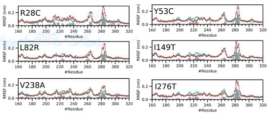 The fluctuation of the amino acid residues for CYP3A5 variants compared to the wild type form (Blue plots) and the variant forms (red plots). The bars indicate the difference of the fluctuation between the equivalent amino acids of the wild type and the variant. We only show the segment corresponding to amino acids 160–320. The RMSF profiles for the entire protein can be found in Supplementary Materials 4.