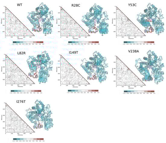 Dynamic Cross-Correlation Matrix (DCCM) analysis for the wild type and the variant forms. The data from each DCCM were mapped on the structure as a link between the pairs of residues established if is above 0.5 or below −0.5. The F/G loop is marked in red color on the structure. The index of the residues started at 0 and the reader should adjust with an offset of 25 to get the correct position in the sequence.