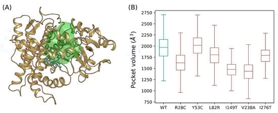 We desired to verify the impact of the genetic diversity on the geometry of the catalytic pocket of CYP3A5 (Figure 6A). All the simulated variants show differences from the wild type form with similar values of variance (Figure 6B). The Y53C variant shows the least difference with an average volume of Å3 which is slightly larger than the volume of the wild type pocket measuring Å3. L82R and I276T show close values of Å3 and Å3 respectively. Moreover, R28C, I149T, and V238A have the smallest catalytic pocket volume with values of Å3, Å3, and Å3 respectively which represent a shrinkage of 17%, 24%, and 27% respectively relative to the volume calculated for the wild type form. The CYP3A subfamily was shown to be promiscuous allowing the accommodation of a large repertoire of drugs in the catalytic pocket of the enzymes. The wild-type pocket volume range of CYP3A5 calculated in our study confirmed such property. Our results also show higher pocket volume values reported previously for CYP3A4 evaluated to 1386 Å3 and 520 Å3 from two different studies []. These values, however, were reported based on single-point calculations for the unbound structure of CYP3A4. Another calculation obtained a value of pocket volume of 765 Å3 of CYP3A4 bound to ritonavir which is almost two times less than the lowest volume calculated to any of CYP3A5 variants in complex with the same drug [].