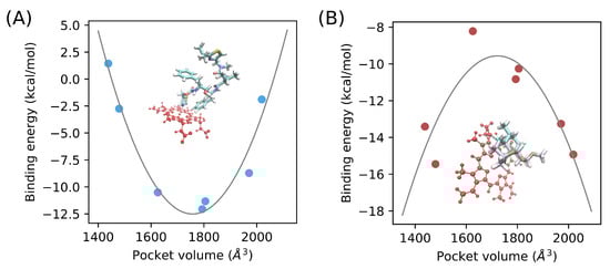 MM-GBSA energy as a function of the catalytic pocket volume for ritonavir (A) and artemether (B). The curves were fitted using a polynomial model of the form where a = , b = , c = for ritonavir and a = , b = , c = for artemether. We also show the ligand spatial configuration relative to the heme group of CYP3A5.