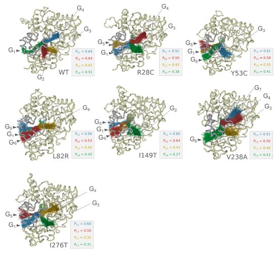 Analysis of CYP3A5 tunnels allows for the evaluation of the effect of the dynamics on the drug pathways that facilitate the transition of the drug to the catalytic site. Figure 8 shows first four clusters identified by Caver 3.0 according to their priority values—the higher the priority the more important is the tunnel. Indeed, all the simulated systems show a distinguished set of tunnels calculated from the microsecond level simulation. In general, the opening gates to the catalytic site are located either in the B/C loop side or between the F/G loop, the 477–483 segment, and the 49–57 segment (upper entry). The distribution of the tunnels differs considerably between the variants. For instance, while the wild type form has a single gate, G1, located near the B/C loop, variants R28C, Y53C, L82R I149T, and I276T have multiple gates. Moreover, Y53C has a single gate at the upper entry contrary to the wild type and other variants that possess more than one gate. At the quantitative level, we also noticed that there is no favorite common gate between the evaluated variants. For instance, the highest priority is equal to 0.64 and corresponds to the G4 gate in the wild type form, while is equal to 0.65 in I149T and corresponds to G5 gate located nearby the B/C loop.