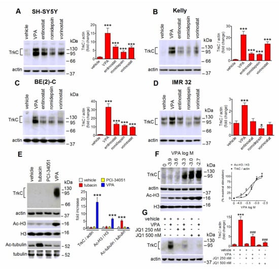 Effects of HDAC and BET inhibitors on TrkC expression in human neuroblastoma cells. (A–D) Cells were incubated for 24 h with either vehicle, 1 mM VPA, 1 µM entinostat, 20 nM romidepsin or 200 nM vorinostat. Cell lysates were analyzed for TrkC expression by Western blot. Values are the mean ± SD of four independent experiments. * p < 0.05 *** p < 0.001 vs control (vehicle). (E) SH-SY5Y cells were treated for 24 h with either vehicle, 5 µM tubacin, 5 µM PCI-34051 or 1 mM VPA. Cell lysates were analyzed for TrkC, actin, acetyl-Lys9/Lys14 histone H3 (Ac-H3), H3, acetyl-tubulin (Ac-tubulin) and tubulin. Densitometric ratios are reported as fold increase with respect to control (vehicle) and are the mean ± SD of four independent experiments. *** p < 0.001 vs the corresponding control (vehicle). (F) SH-SY5Y cells were incubated for 24 h with the indicated concentrations of VPA. Cell lysates were analyzed for TrkC expression and histone H3 acetylation. Values are the mean ± SD of four independent experiments. (G) SH-SY5Y cells were preincubated for 1 h with either vehicle, 250 nM or 500 nM (+)-JQ1 (JQ1) and then treated with either vehicle or 1 mM VPA for 24 h. Cell lysates were analyzed for TrkC expression. Values are the mean ± SD of four independent experiments. *** p < 0.001 vs. control (vehicle + vehicle); ### p < 0.001 vs. vehicle + VPA by ANOVA followed by Tukey’s test.