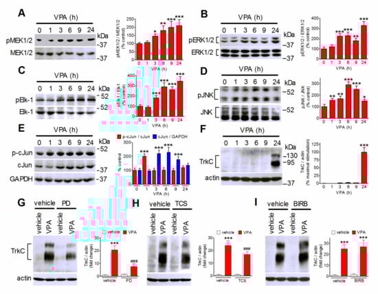 Participation of ERK1/2 and JNK in VPA-induced TrkC upregulation. (A–F) SH-SY5Y cells were incubated in serum-free medium with 1 mM VPA for the indicated periods of time. Zero time samples were treated with vehicle and used as control. Cell lysates were analyzed for phospho-MEK1/2 (pMEK1/2), MEK1/2 (A), phospho-ERK1/2, ERK1/2 (B), phospho-Ser383-Elk-1 (pElk-1), Elk-1 (C), phospho-JNK (pJNK), JNK (D), phospho-Ser73-cJun (p-cJun), cJun, GAPDH (E), TrkC and actin (F). Values are the mean ± SD of four independent experiments. * p < 0.05, ** p < 0.01, *** p < 0.001 vs. control. (G–I) SH-SY5Y cells were preincubated for 1 h with either vehicle, 25 µM PD 98,059 (PD) (G), 10 µM TCS JNK6o (TCS) (H), or 1 µM BIRB 0796 (BIRB) (I) and then exposed to either vehicle or 1 mM VPA for 24 h. Cell lysates were analyzed for TrkC expression. Values are the mean ± SD of four experiments. *** p < 0.001 vs. control (vehicle + vehicle); ### p < 0.001 vs. vehicle + VPA by ANOVA followed by Tukey’s test.