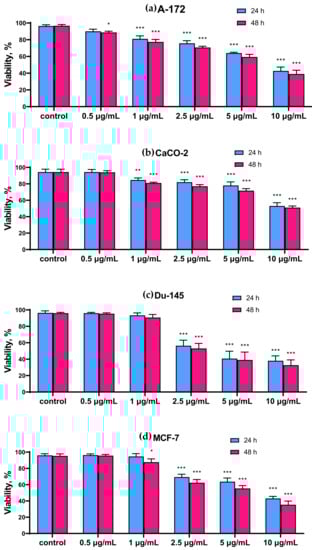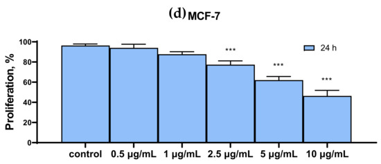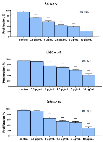 Figure 2 shows the results of the cytotoxic effect of various SeNP concentrations, obtained by MTT analysis. It can be concluded that the proliferative properties of A-172 and DU-145 cells decreased more significantly compared to the other two Caco-2 and MCF-7. Thus, 24 h treatment of A-172 and DU-145 cells with 10 μg/mL SeNP led to a decrease in their proliferative properties by 70–80% (Figure 2a,c), while for Caco-2 and MCF-7 cells, the figure was approximately 50–60% (Figure 2b,d).