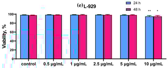 It was found that SeNP at concentrations of less than 1 μg/mL had no cytotoxic effect on the studied cancer cells, with the exception of the A-172 cell line, for which 0.5 μg/mL SeNP was the minimum concentration affecting its metabolic activity (Figure 1a). In all studied cancer cell lines, a significant decrease in viability was observed when cells were treated with the highest concentration of SeNP (10 μg/mL). Thus, for MCF-7 and A-172 cells, this concentration of nanoparticles contributed to a decrease in viability by approximately 50%; a similar effect was observed on prostate adenocarcinoma cells (DU-145 cells), however, when they were treated with a half-dose of SeNP (5 μg/mL) (Figure 1a,c,d). Caco-2 cells turned out to be less sensitive to the action of SeNP (Figure 1b). In addition, none of the studied SeNP concentrations appeared to affect the viability of normal (healthy) cells, as which, for example, mouse fibroblasts (line L—929) were selected (Figure 1e). The time of cell treatment with nanoparticles in this experiment was 24 h and 48 h. However, according to the obtained results, no significant differences were found in the viability test. Therefore, all subsequent experiments were carried out before and after 24 h of cancer cell treatment with SeNP.