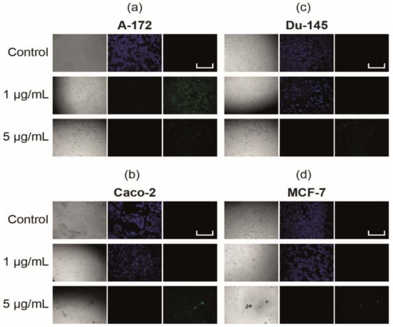 Simultaneous monitoring of apoptotic, necrotic, and healthy cells after 24 h of their treatment with 1 μg/mL and 5 μg/mL SeNP using fluorescence microscopy revealed the presence of the apoptotic death of cancer cells of all studied lines when they were treated with 5 μg/mL SeNP (Figure 3), while this was only the case for the A-172 cell line at 1 μg/mL (Figure 3a).