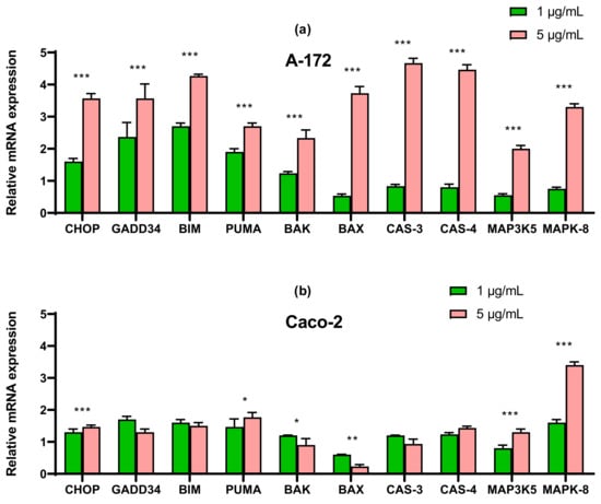 In cells Caco-2, SeNP did not significantly affect the expression of pro-apoptotic genes, which explains the absence of apoptosis when cells were treated with 1 μg/mL, whereas when cells were exposed to 5 μg/mL, a significant increase (more than 3 times) in the expression of mitogen-activated kinase 8 was observed (Figure 4b).