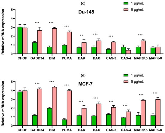 In prostate carcinoma cells, an increase in the expression of only four pro-apoptotic genes was observed: p-53-dependent proteins BIM and PUMA, but not BAK and BAX. A threefold increase in the expression of mRNA CHOP and GADD34 was also observed (Figure 4c).