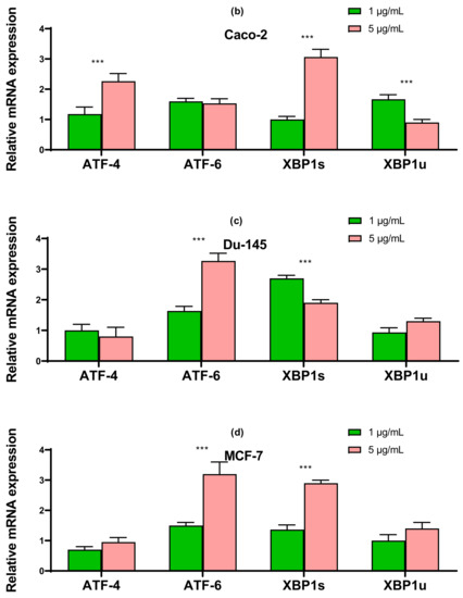 qRT PCR analysis of the expression of ER stress response in gene (1 and 5 μg/mL SeNP, 24 h)-treated cancer cells (a)—A-172; (b)—Caco-2; (c)—Du-145; (d)—MCF-7. Each value is the mean ± SD of at least three independent experiments (n ≥ 3, p < 0.05). GAPDH was used as an internal control for normalization. Two-way ANOVA with Sidak’s multiple comparisons test. Comparison 1 μg/mL and 5 μg/mL, *** p-level < 0.001.