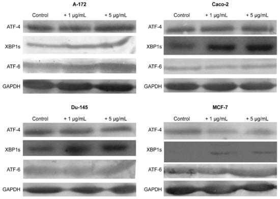 Cell lines A-172, DU-145, MCF-7, Caco-2, and L-929 were purchased from ATCC (Manassas, VA, USA) and were harvested in a DMEM medium supplemented with 10% fetal bovine serum. MTT Cell Proliferation Assay Kit and Apoptosis/Necrosis Detection Kit were purchased from Abcam (Cambridge, UK). Antibodies for Western blots included anti-Gapdh, anti-XBP1, anti-ATF-4, anti-ATF-6, and secondary antibody conjugated to horseradish peroxidase were purchased from Abcam (Cambridge, UK) and Invitrogene (Waltham, MA, USA). Ionomycin calcium salt, Thapsigargin were purchased from Sigma-Aldrich (Saint Louis, MO, USA).