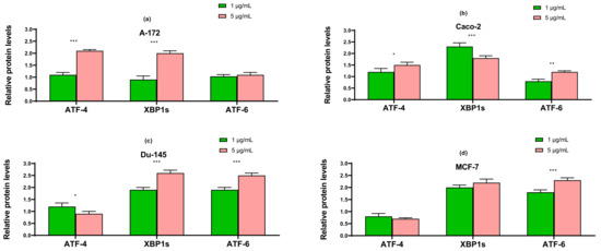 The results obtained using the two approaches of real-time PCR and Western blotting shown in Figure 5, Figure 6 and Figure 7 duplicate others. It can be concluded that SeNP is able to activate in cells A-12 the PERK signaling pathways in A-172 cells, as evidenced by the increased expression of key participants in this ATF-4 pathway. In addition, an increase in the expression of the spliced form XBP1s mRNA may indicate the activation of the IRE1α signaling pathway as well (Figure 5a, Figure 6a and Figure 7a). In cells Caco-2, activation of the signaling pathway mediated by nanoparticles can also be observed (Figure 5b, Figure 6b and Figure 7b). In the other two lines, DU-145 and MCF-7, 5 μg/mL SeNP activated IRE1α and ATF-6 signaling pathways (Figure 5c,d, Figure 6c,d and Figure 7c,d).