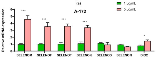 The SeNP had the greatest effect on the expression of ER resident selenoproteins in cells A-172 and MCF-7. In both cell lines, 5 μg/mL SeNP significantly increased the expression of SELENOM and SELENOK (more than 3–4 times as compared to intact cells) (Figure 8a,d). In glioblastoma cells, an increase in the expression of SELENOF and SELENOT was also observed more than threefold, and in cells MCF-7, a significant increase in the expression of DIO2 mRNA was observed upon treatment of cells with 5 μg/mL SeNP, while 1 μg/mL SeNP, on the contrary, reduced the expression of mRNA of this selenoprotein (Figure 8d).