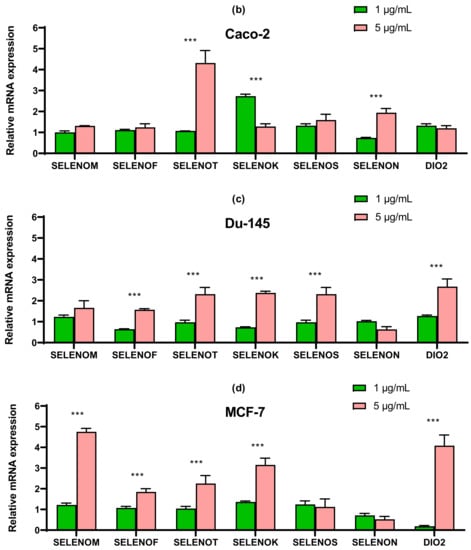 qRT-PCR analysis of the expression of ER resident selenoprotein gene (1 and 5 μg/mL SeNP, 24 h)-treated cancer cells (a)—A-172; (b)—Caco-2; (c)—Du-145; (d)—MCF-7. Each value is the mean ± SD of at least three independent experiments (n ≥ 3, p < 0.05). GAPDH was used as an internal control for normalization. Two-way ANOVA with Sidak’s multiple comparisons test. Comparison 1 μg/mL and 5 μg/mL, *** p-level < 0.001, * p-level < 0.05.