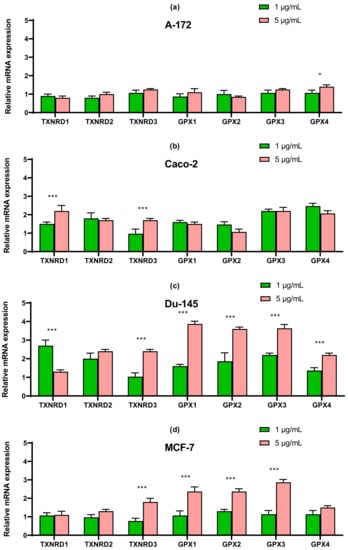 qRT-PCR analysis of the expression of selenium-containing glutathione peroxidase and thioredoxin reductase gene (1 and 5 μg/mL SeNP, 24 h)-treated cancer cells (a)—A-172; (b)—Caco-2; (c)—Du-145; (d)—MCF-7. Each value is the mean ± SD of at least three independent experiments (n ≥ 3, p < 0.05). GAPDH was used as an internal control for normalization. Two-way ANOVA with Sidak’s multiple comparisons test. Comparison 1 μg/mL and 5 μg/mL, *** p-level < 0.001, * p-level < 0.05.