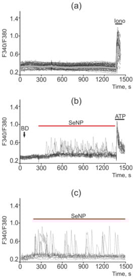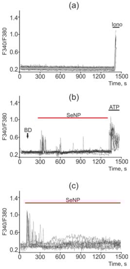 Ca2+ signals in control A-172 cells (a) and in response to application of 0.5 µg/mL (b) and 2.5 µg/mL (c) SeNP. BD = application of bi-distilled water equivalent to the amount of SeNP solvent. At the end of the experiment, the Ca2+ ionophore, Ionomycin (Iono, 1 µM), or the purinoreceptor activator, ATP (10 µM), was applied to normalize the [Ca2+]i signal to the maximum. Typical Ca2+ signals of cells are presented.