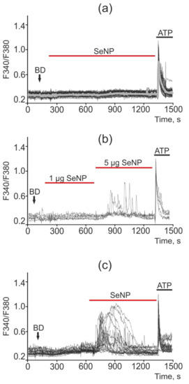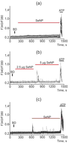 The least sensitive to the action of SeNP was the MCF-7 cancer cell line, in which only high concentrations of SeNP (starting from 5 μg/mL) caused the generation of Ca2+ signals, as can be seen from Figure 10b,c, upon the application of 1 μg/mL SeNP none of the cells responded. An increase in the SeNP concentration to 5 μg/mL led to a calcium response in only 5 out of 73 cells, i.e., 6.8%. In this case, the cells are alive and functional, since they respond to the application of ATP at the end of the experiment. SeNP at a concentration of 10 μg/mL elicited signals in 100% of cells; moreover, application of ATP at the end of the experiment resulted in high-amplitude signals, which indicates incomplete emptying of the Ca2+ pool in the ER; the cells are probably capable of generating Ca2+ responses upon subsequent additions of SeNP (Figure 12a–c).