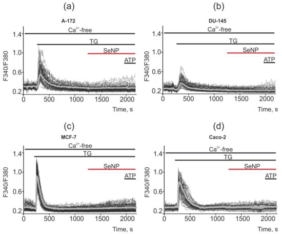 Suppression of Ca2+ signals in cancer cells in response to application of SeNP after depletion of the Ca2+ ER pool by adding the SERCA inhibitor thapsigargin (TG, 1 µM) in a nominally calcium free medium supplemented with 0.5 mM Ca2+ chelator EGTA. (a,b) application of 0.5 µg/mL SeNP to A-172 and DU-145 cells; (c,d) application of 10 µg/mL SeNP to MCF-7 and Caco-2 cells. The absence of Ca2+ signals for the application of 10 μM ATP indicates a complete absence of Ca2+ entering the outside of the cell and mobilization from the ER. Ca2+ signals in the field of view of the microscope in one experiment and their average values (gray curves) are presented here.