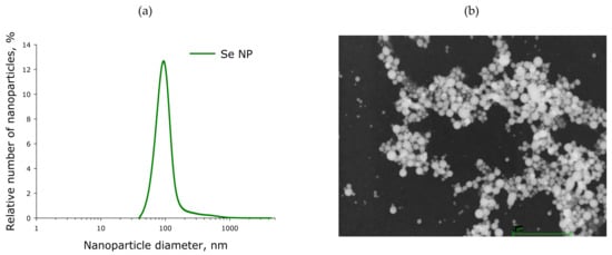 Size and morphology of SeNP obtained by laser ablation. (a) SeNP size distribution. Data obtained using an analytical disk centrifuge and confirmed by DLS. (b) TEM micrograph of selenium nanoparticles. Scale bar—1 µm.