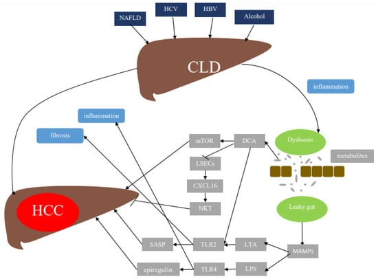 The gut microbiota, also known as the ‘forgotten organ’, is the largest micro-ecosystem in the human body, which encompasses more than 1014 microorganisms. It is vital to the host’s metabolism and immune response, including antitumor response following immunotherapy and chemotherapy []. Although the liver is not in direct contact with the microbiota, it has a tight bidirectional link to the gut through the biliary tract, hepatic portal vein, and bile secretions [,]. However, dysbiosis, which is defined as qualitative and quantitative alterations of the gut microbiota, has the potential to destroy the gut barrier and increase intestinal penetrability. Moreover, the translocation of gut bacteria, bacterial overgrowth, and dysplasia of the immune system result in a condition known as “leaky gut” []. Both dysbiosis and the leaky gut are associated with a cycle of hepatocyte injury and regeneration characteristic of chronic liver disease, thereby encouraging the stepwise progression from fibrosis to cirrhosis and ultimately HCC.