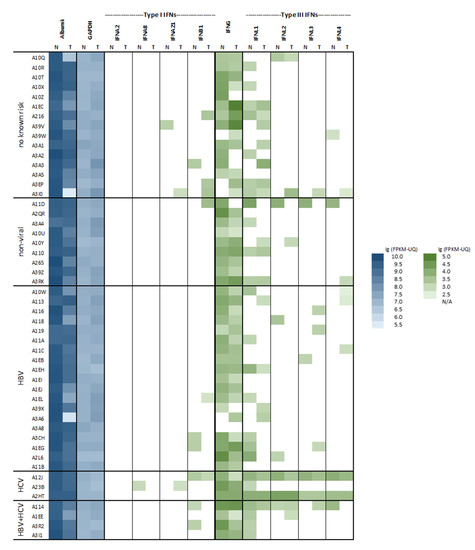 Transcriptome profiles are available from 371 tumors and 50 corresponding nontumorous tissue specimens. This enabled the analysis of type I and type III IFN and IFN effector gene activation in nonmalignant liver tissue with regard to primary diseases and, also, in corresponding malignant tissue. Type I IFN gene transcription was representatively read by the amount of mRNAs of three single species: IFNA2, IFNA8, and IFNA21 and by IFNB, while all four type III IFN genes, IFNL1-4, were regarded. The transcriptional activation of type II IFNG, albumin, and GAPDH as references was considered as well. Regarding nonmalignant liver tissue, type I IFNs—particularly, IFN-α mRNAs—were undetectable in almost all samples: in patients with nonviral etiology and, also, in those with HBV or HCV infections (Figure 1). Among type III IFN mRNAs, IFNL1 was found to be a more abundant species, but all of them, including IFNL4, were detectable preferentially in patients with HCV infections. This is in line with previous findings [10,12,13].
