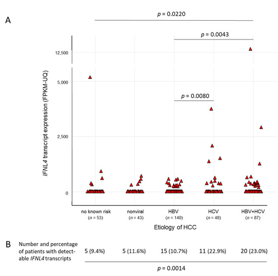 By analyzing the whole set of tumor tissue samples, likewise, detectable levels of IFNL4 transcripts were present in a small portion of the samples only (56/371) (Figure 2A). They were found to be more abundant in patients with HCV-related HCCs than in those without a history of HCV infection (Figure 2B). Being, for the most part, on an overall low level, the mRNA levels beyond that (>1000 FPKM-UQ) were noticeable, with one exception for HCC patients with HCV or HCV/HBV coinfection histories only (1/236 vs. 7/135, χ2-test p = 0.0024) (Figure 2A).